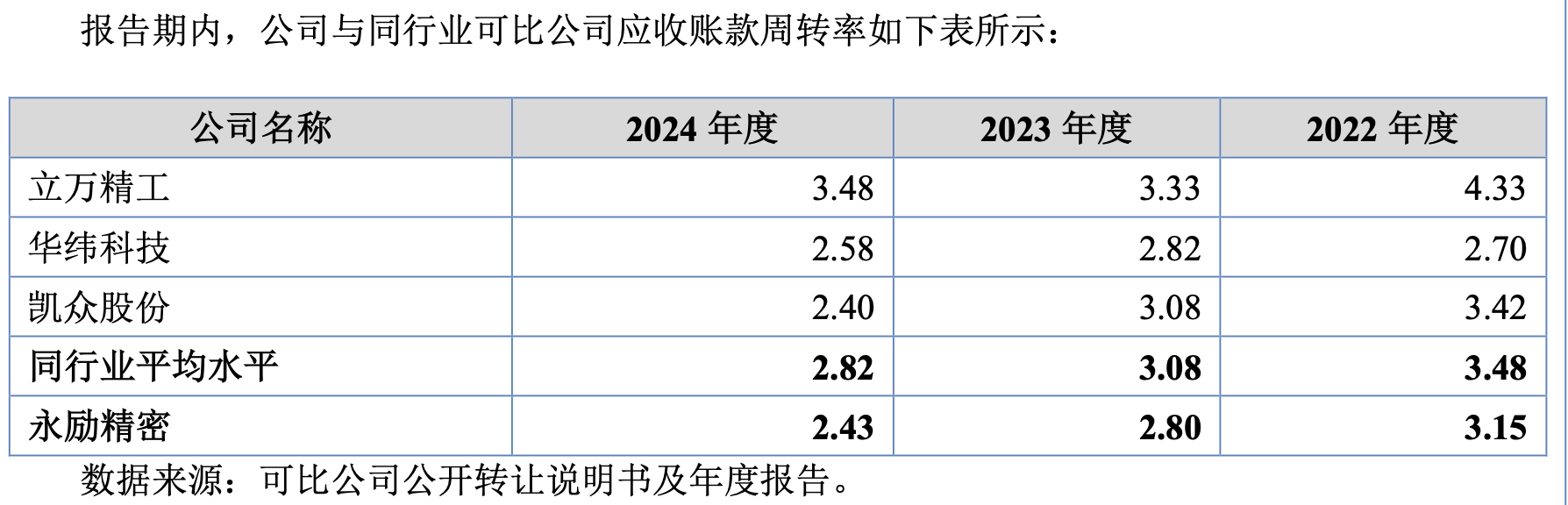 这种效率低下的回款,直接拉低了公司的运营效率。2022年到2024年,永励精密的应收账款周转率从3.15次一路下滑至2.43次,持续低于同行均值;存货周转率同样大幅弱于行业平均水平。这种被大客户“深度套牢”的困境,让公司的财务健康度大打折扣,所谓的业绩增长,很大程度上只是体现在账面上的“纸面富贵”。