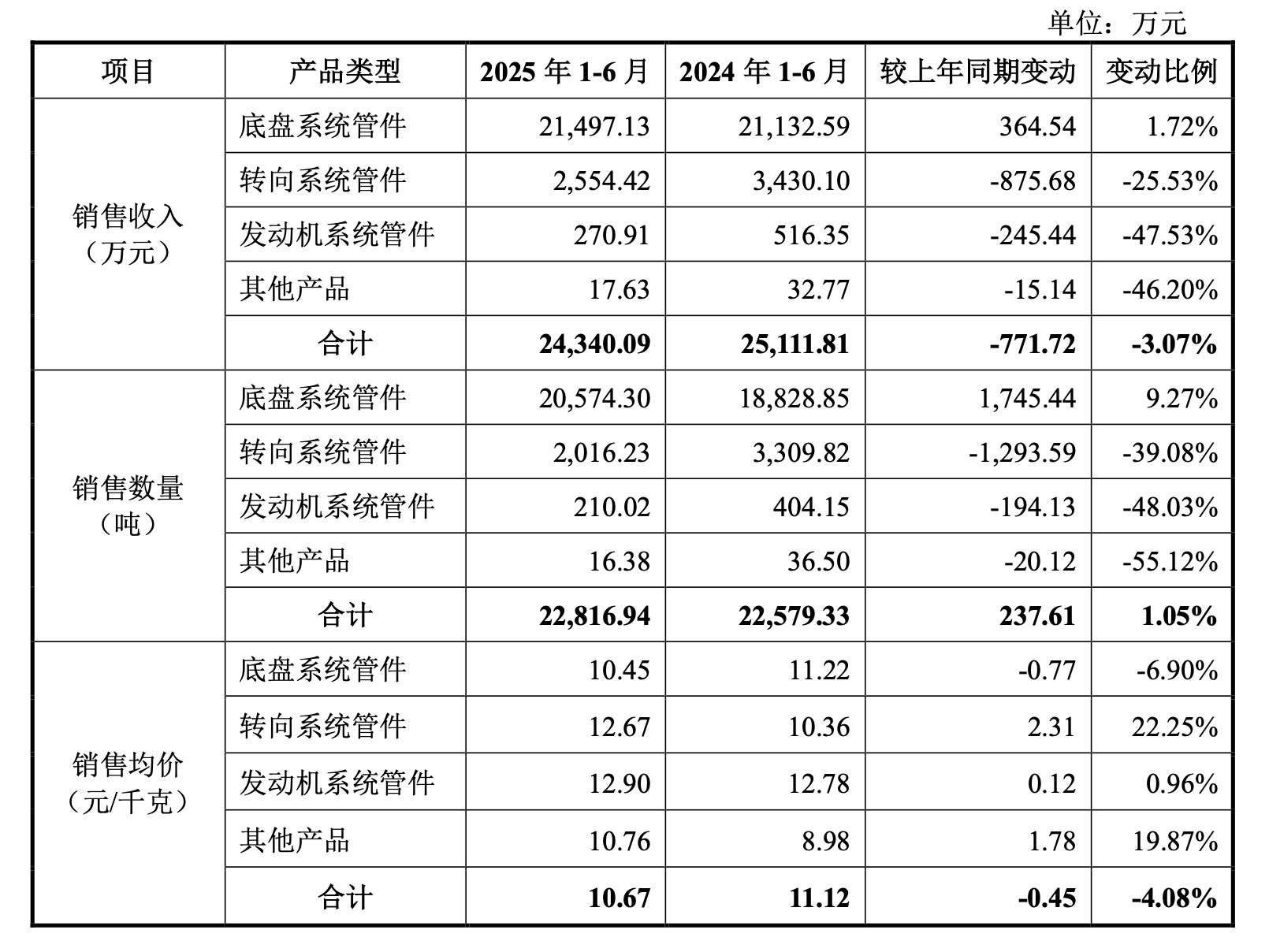 从更深层次看,永励精密正陷入“以价换量”的被动局面。2025年上半年,作为核心产品的底盘系统管件,销量增长9.27%,但销售均价却下降6.90%。更令人担忧的是,其产品结构正发生劣变,高附加值的转向系统管件和发动机系统管件销售收入分别下滑25.53%和47.53%,显示出公司在传统优势领域的阵地正在被动摇。一旦原材料价格触底反弹,这种靠成本压降撑起的利润增长将面临风险。