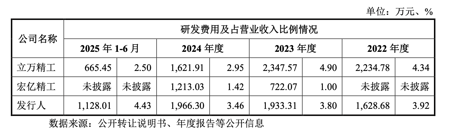 在汽车零部件行业技术迭代日新月异的背景下,永励精密却选择了“节流”研发。2022年到2024年间,公司研发费用率分别为3.92%、3.80%、3.46%,占比本就不高,却仍然呈逐年下降趋势,2024年末,研发人员数量甚至不增反减。2025年上半年,公司在研发上的投入力度较大,研发费用率达到了4.43%,研发人员也达到76人。