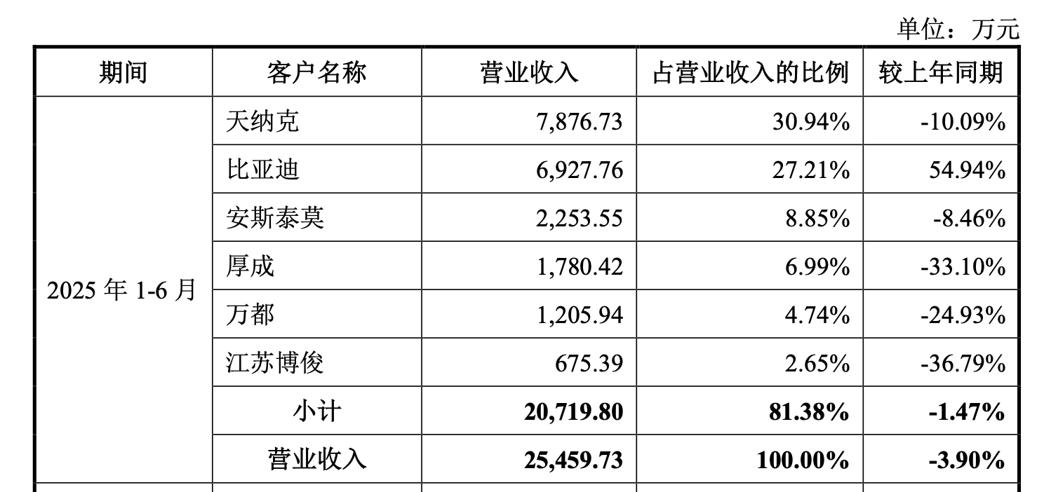 报告期内,永励精密前五大客户营收占比从63.07%一路飙升至78.73%。其中,对比亚迪的销售占比从2022年的3.54%火箭式蹿升至2025年上半年的27.21%,比亚迪迅速成为公司的第二大客户,且是寄售模式下的最大客户。