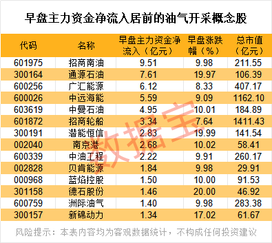 早盘,主力资金大幅流入油气开采板块,板块合计净流入资金超55亿元。其中,招商南油主力资金净流入9.51亿元,排名第一;通源石油净流入超7亿元,广汇能源净流入超6亿元,中远海能、中曼石油净流入超4亿元。
