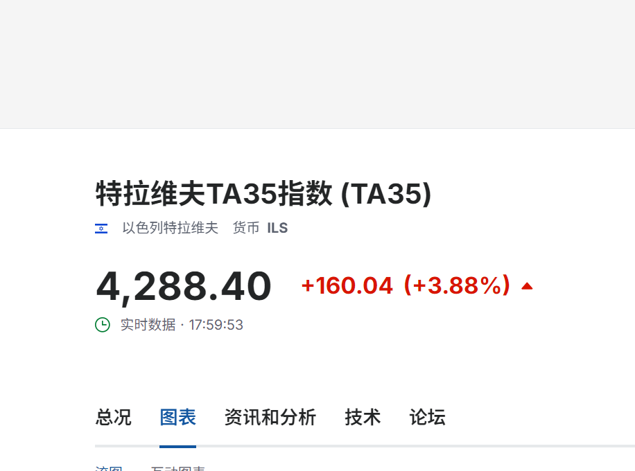 以色列特拉维夫TA35指数一度涨超4%,升至4300点上方,涨幅现回落至3.88%。