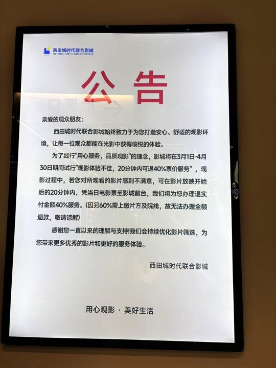 今天下午,记者致电杭州西田城时代联合影城,影城营运副经理周明慧表示,该服务的适用时间为3月1日至4月30日。为期两个月的试行时间里,影院想看看市场的反馈到底如何。申请退款流程也十分简单,观众在所购场次影片开场后20分钟内,若觉得影片与预期不符、观看体验不佳,无需过多解释,凭当日有效电影票到影城前台,即可办理退款,退还实际支付金额的40%。退费申请须在影城现场完成,一旦离场,将无法再办理。
