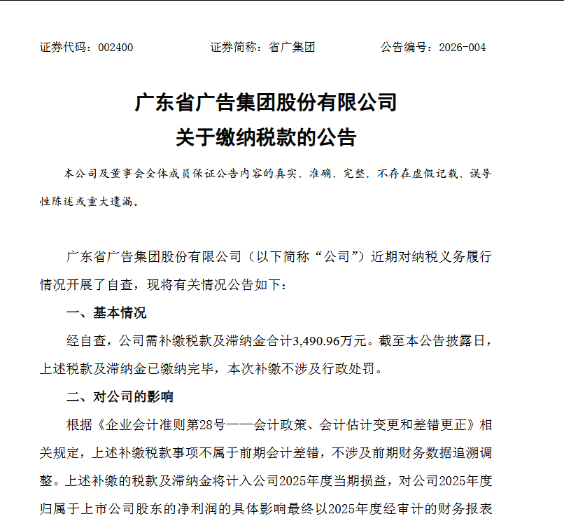 3月2日,广东省广告集团股份有限公司(以下简称“省广集团”)公告,公司近期对纳税义务履行情况开展了自查,公司需补缴税款及滞纳金合计3,490.96万元。