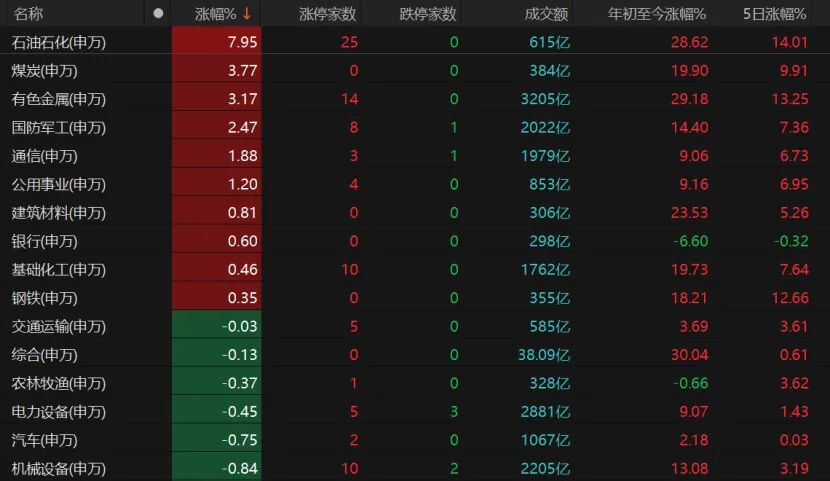 板块涨少跌多,分化明显。石油石化板块涨近8%,煤炭、有色金属大涨,国防军工、通信也涨势喜人。
