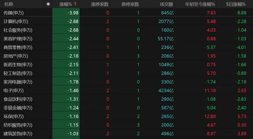 传媒板块继续走低,近5日累计跌幅近9%,年初至今涨幅缩至7.63%。传媒、社会服务、美容护理、商贸零售、房地产、医药生物、轻工制造板块跌幅也超过2%。