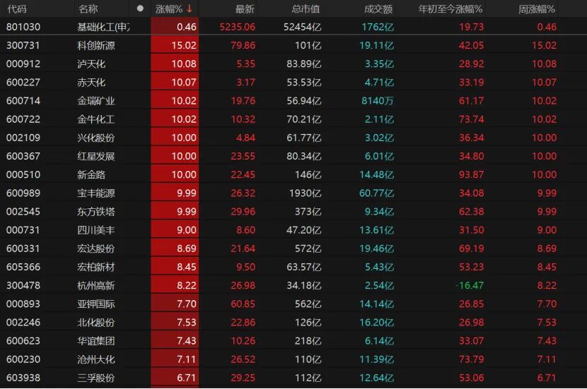 10只化工股涨停,科创新源涨逾15%,泸天化、赤天化、金瑞矿业、金牛化工、兴化股份等个股涨停。