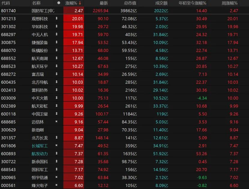 8只国防军工个股涨停,观想科技、华如科技“20cm”涨停,中无人机、捷强装备、纵横股份、航天南湖均大涨。北方导航、雷科防务、中天火箭、航天彩虹等个股也涨停。