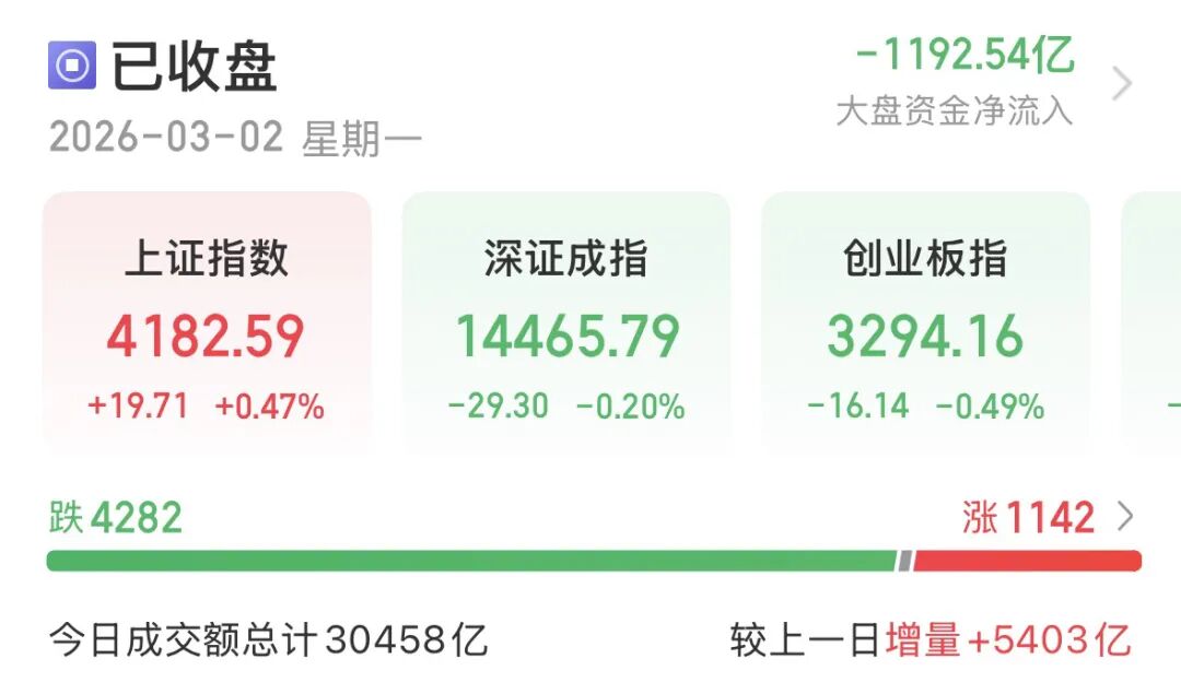 安爵资产董事长刘岩向记者分析,在美伊地缘冲突的外部冲击下,今日A股整体呈现“外弱内强”的韧性特征。早盘虽受避险情绪拖累一度下探,但在权重护盘与两会维稳预期支撑下快速回升;沪指收红、创业板小幅调整,市场未现系统性恐慌。短期调整仅是情绪面的集中宣泄,并非中长期上行趋势的扭转。