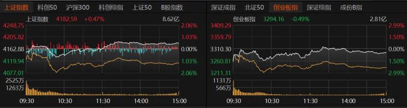 指数表现涨跌不一,波动温和。早盘低开后一度回升,随后再度下挫,午后震荡拉升,尽显韧性。沪指收涨0.47%报4182.59点,创业板指收跌0.49%报3294.16点,深证成指微跌。沪深300、上证50微红,科创50收跌1.56%,北证50收跌近4%。