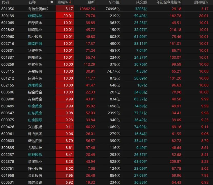 14只有色金属个股涨停,晓程科技“20cm”涨停,西部黄金、翔鹭钨业、锡业股份等个股均涨停。