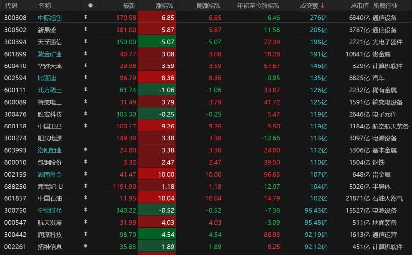 今日亏钱效应明显,4282只个股收跌,跌停股21只;1142只个股收涨,涨停股94只。交易活跃股方面,共计16只个股日成交额超过100亿元。CPO概念龙头股“易中天”交易量靠前,中际旭创涨近7%,新易盛涨近6%,但天孚通信跌幅超过5%。紫金矿业、包钢股份、洛阳钼业均收红,中国石油、湖南黄金涨停,中国卫星涨逾9%。
