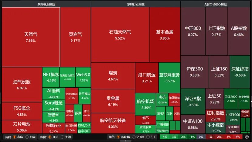 盘面上,天然气、页岩气、石油天然气、贵金属、航空航天装备、F5G概念大涨,但智谱AI、AI语料、短剧互动游戏、航空机场、营销服务等板块大跌。