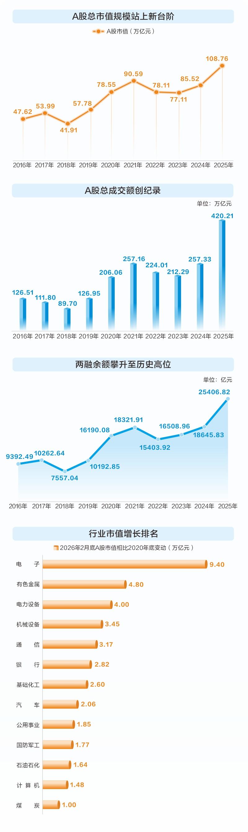 2026年2月底A股市值与2020年底相比,有色金属、机械设备、通信、汽车等行业A股市值亦显著增长,增长值均超过2万亿元,共同勾勒出经济结构转型升级的资本图谱。