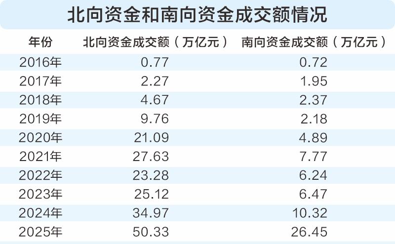 据数据宝统计,2025年,北向资金合计成交额50.33万亿元,相比2020年增长1.39倍,创历史新高。“十四五”时期,北向资金合计成交额161.34万亿元,相比“十三五”时期增长3.18倍。
