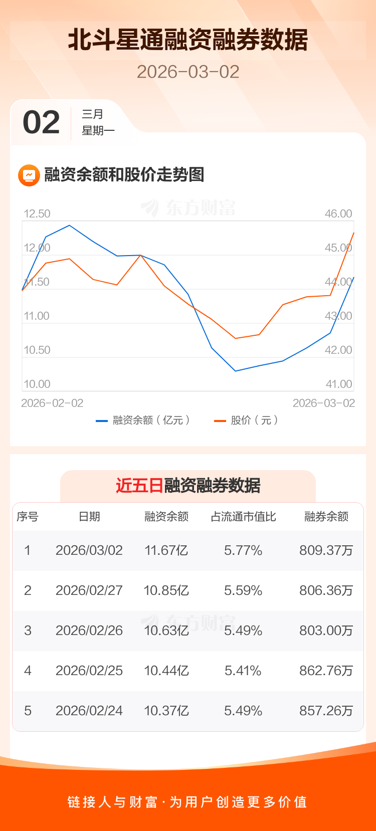 交易所最新数据显示,北斗星通于2026年3月2日获融资买入2.65亿元,融资偿还1.83亿元,当日融资净买入8231.95万元。目前,该股融资余额11.67亿,占流通市值比例为5.77%。