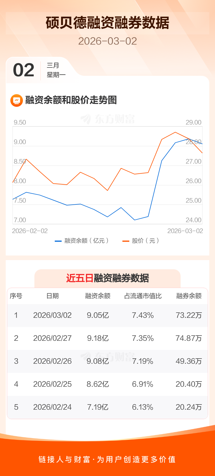 交易所最新数据显示,硕贝德于2026年3月2日获融资买入5967.68万元,融资偿还7327.12万元,当日融资净偿还1359.44万元。目前,该股融资余额9.05亿,占流通市值比例为7.43%。