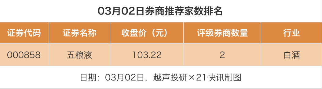 从券商推荐家数来看,3月2日有23家上市公司得到券商推荐,其中五粮液获得2家推荐,安达科技、中国化学等获得1家推荐。