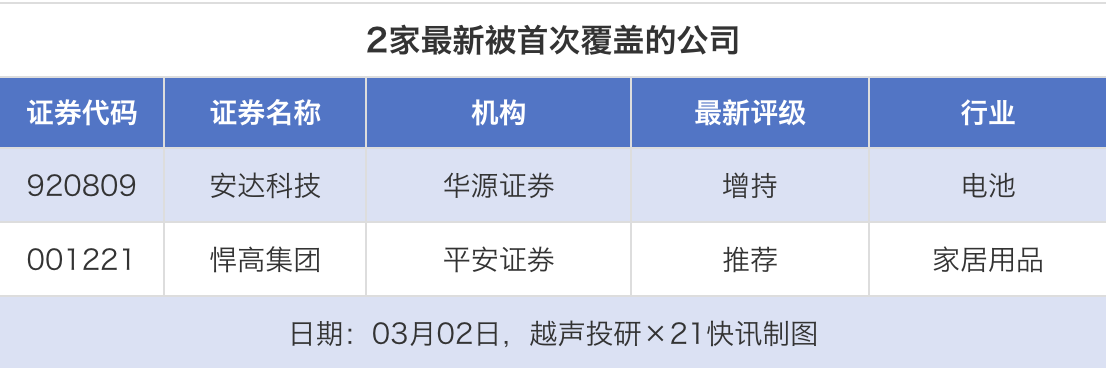 首次覆盖方面,3月2日券商共给出了2次首次覆盖,其中安达科技获得华源证券给予“增持”评级,悍高集团获得平安证券给予“推荐”评级。