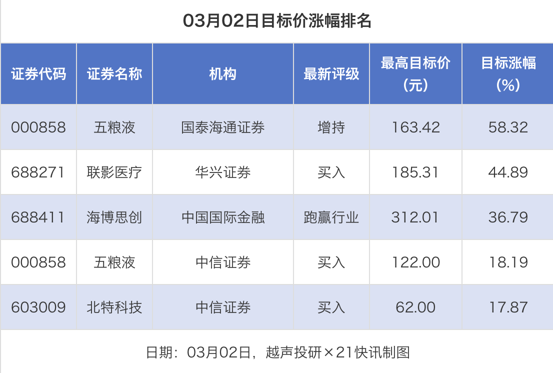 越声投研数据显示,3月2日,券商给予上市公司目标价共5次,按最新收盘价计算,目标价涨幅排名居前的公司有五粮液、联影医疗、海博思创,目标价涨幅分别为58.32%、44.89%、36.79%,分别属于白酒、医疗器械、其他电源设备行业。