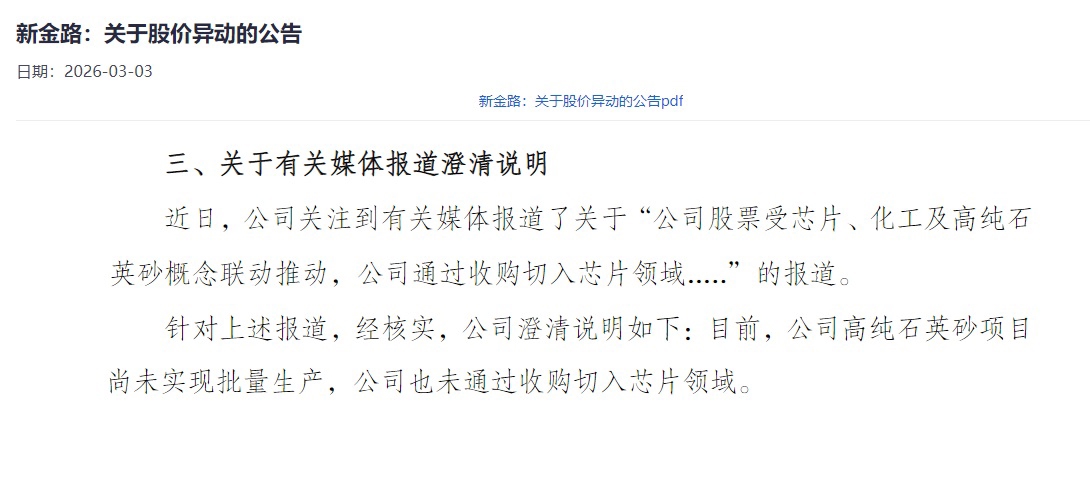 公告显示,新金路股票于2026年2月27日,3月2日连续两个交易日收盘价格涨幅偏离值累计超过20%,根据《深圳证券交易所交易规则》等有关规定,属于股票交易异常波动的情形。