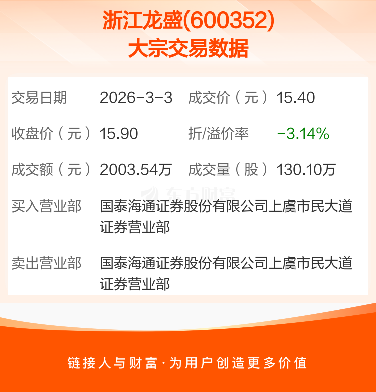 2026年3月3日,浙江龙盛发生1笔大宗交易,共成交130.10万股,成交金额2003.54万元,占其流通市值比例为0.04%。