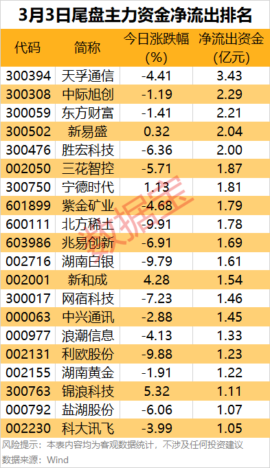 据数据宝统计,20股尾盘主力资金净流出金额均超1亿元。天孚通信尾盘净流出金额达3.43亿元,居首;中际旭创、东方财富、新易盛和胜宏科技尾盘主力资金净流出金额均在2亿元及以上。