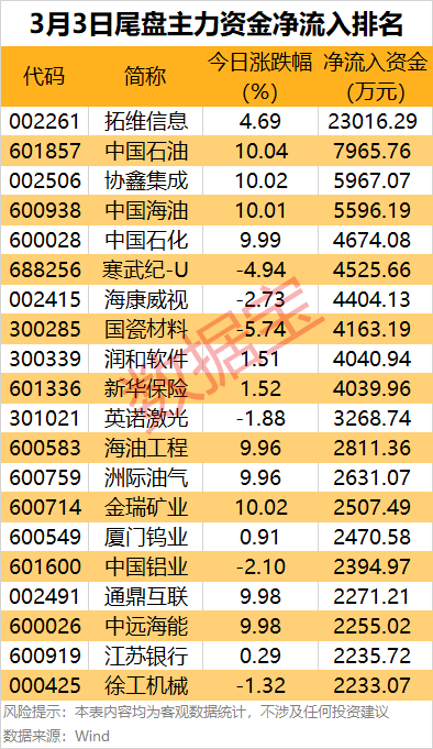 “三桶油”中国石油、中国海油、中国石化均涨停,尾盘主力资金净流入均超4600万元。