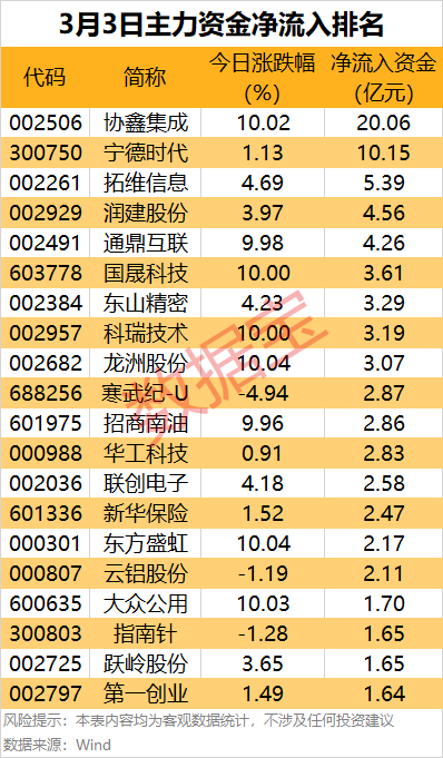 宁德时代主力资金净流入10.15亿元,居次席。此外,拓维信息、润建股份、通鼎互联、国晟科技和东山精密等主力资金净流入金额居前。