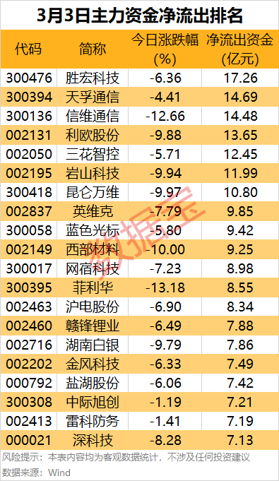 PCB龙头股胜宏科技主力资金净流出17.26亿元,居首。天孚通信主力资金净流出14.69亿元,居次席。