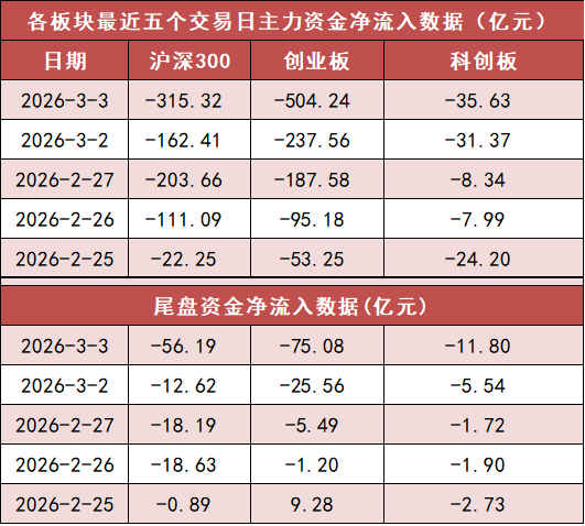 沪深300今日主力资金净流出315.32亿元,创业板净流出504.24亿元。