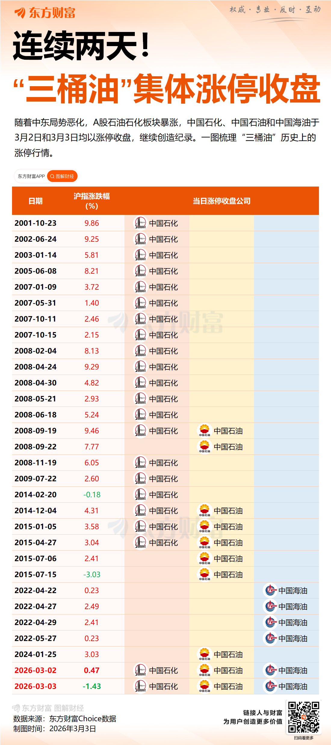 受中东地缘政治局势骤然升级影响,A股油气板块迎来历史性行情。3月2日至3月3日,中国石油(601857.SH)、中国石化(600028.SH)、中国海油(600938.SH)三大石油巨头连续两个交易日集体涨停,创下A股市场历史纪录。
