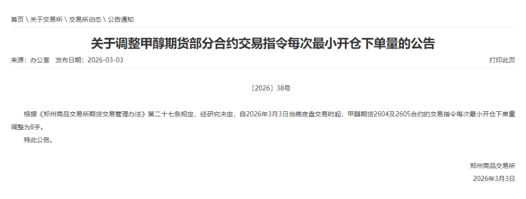 此外,郑商所同日公告,经研究决定,自2026年3月3日当晚夜盘交易时起,甲醇期货2604及2605合约的交易指令每次最小开仓下单量调整为8手。