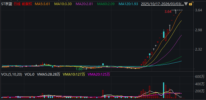 据悉,2026年1月23日至2026年2月26日期间,ST京蓝股票价格涨幅为116.67%。Wind统计数据显示,公司股票在这19个交易日里收获了15个涨停。