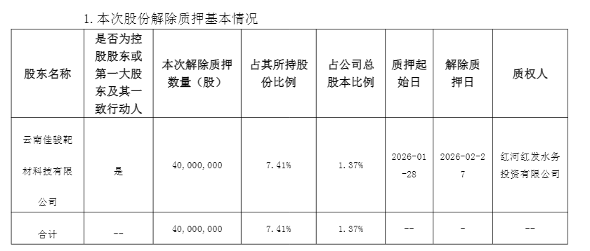 同日,ST京蓝还发布了《关于控股股东部分股份解除质押的公告》,公告显示,控股股东云南佳骏靶材科技有限公司(以下简称“佳骏靶材”) 解除质押4000万股股份,占其所持股份的7.41%及公司总股本的1.37%;截至公告披露日,佳骏靶材累计质押股份为5亿股,占其所持股份的92.59%及公司总股本的17.11%。