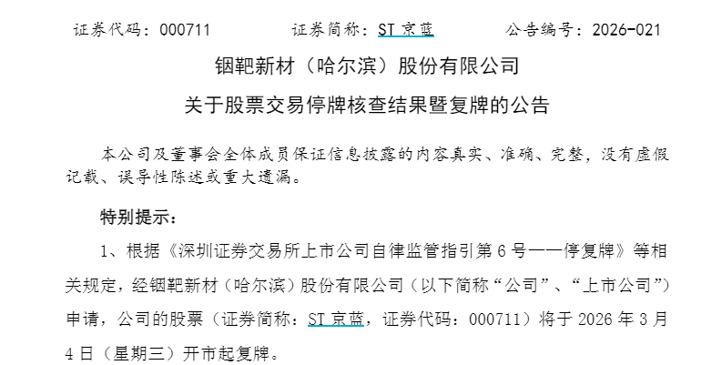 3月3日晚间,ST京蓝(000711)发布公告称,公司股票停牌核查结束,将于2026年3月4日(星期三)开市起复牌。