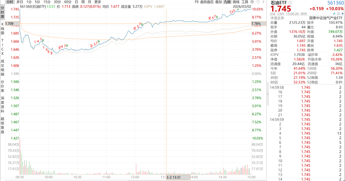 国内油气板块同步走强,石油ETF(561360)表现尤为突出,近7日净值增长率达10.06%,近一月上涨12.86%,近三月涨幅高达38.06%,3月2日盘中强势涨停,单日成交额突破36亿元,换手率超100%,资金涌入迹象显著,成为普通投资者分享油价上涨红利的核心工具。在地缘风险常态化、全球供给弹性弱化、需求刚性支撑的多重逻辑下,油气资产的短期波段机会与中长期配置价值持续凸显。
