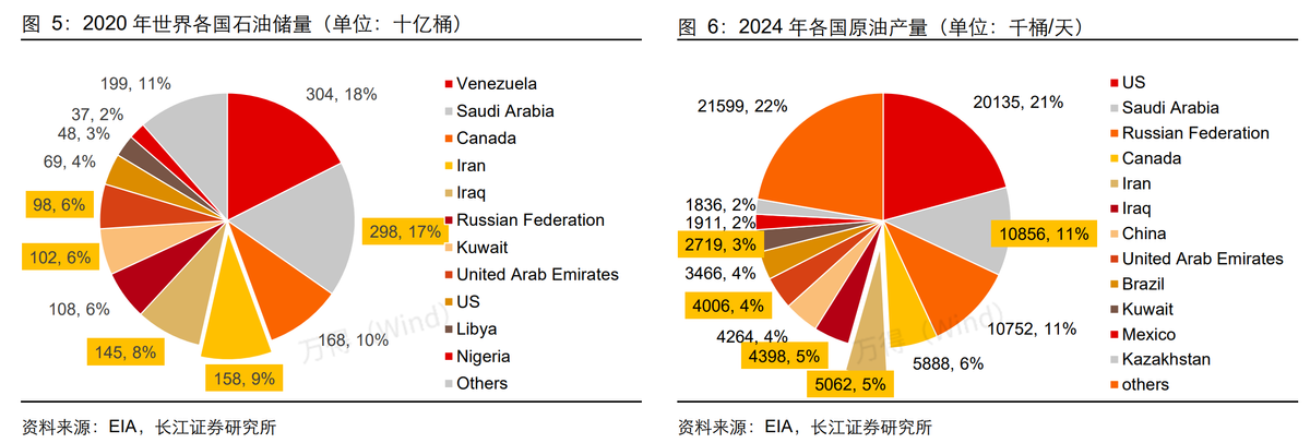 资源端:伊朗是中东乃至全球重要油气资源国。资源端方面,伊朗油气资源禀赋优异,是全球能源供给体系中具有重要影响力的核心国家之一。伊朗油气资源丰富,2020 年油气探明储量分别位居全球第四和第二;2024 年伊朗原油年产量在全球总产量中分别占比约 5%和 6%,在中东国家中原油和天然气产量分别位居第二和第一,也均居世界前列。