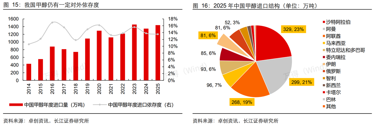 在石化产业链上,伊朗在全球甲醇、尿素、乙烯等供应体系中占据重要位置。依托廉价天然气和凝析气,伊朗石化行业的生产能力已达到约 1 亿吨,其中 60%用于生产甲醇、氨、乙烯和其他基本化学品等关键基础产品,在全球供应体系中占据重要位置。中国甲醇、PE、乙二醇仍有一定对外依存度,进口结构中包括伊朗在内的波斯湾体系国家占比显著,一旦伊朗及波斯湾的产能受扰,对中国供应或产生直接影响。