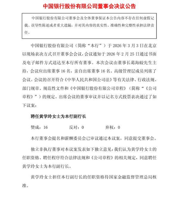 中国网财经3月4日讯 3月3日,中国银行发布董事会决议公告,同意聘任黄学玲为该行副行长。黄学玲担任中国银行副行长的任职资格待国家金融监督管理总局核准。