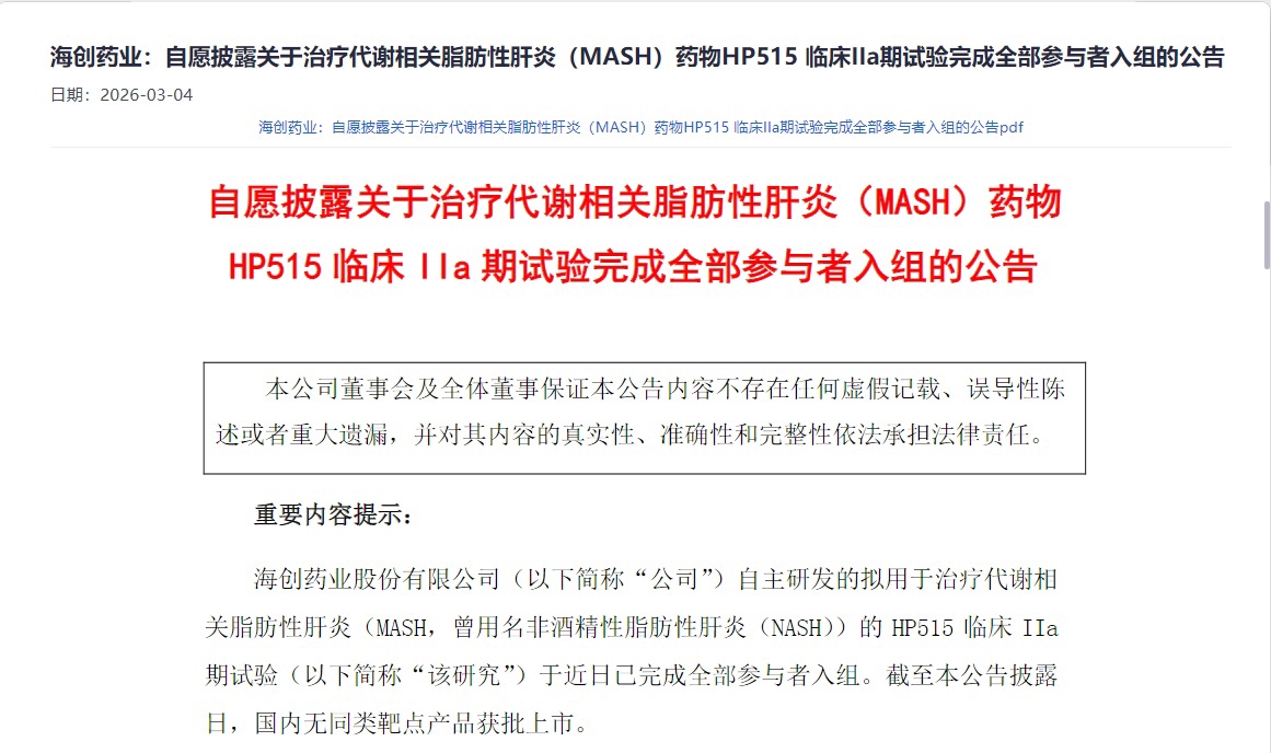 海创药业(688302)3月3日盘后发布了自愿披露关于治疗代谢相关脂肪性肝炎(MASH)药物HP515 临床Ⅱa期试验完成全部参与者入组的公告。在业内人士看来,如果后续公布的数据是积极的,这将是公司从“临床早期”迈向“临床中后期”的转折点。