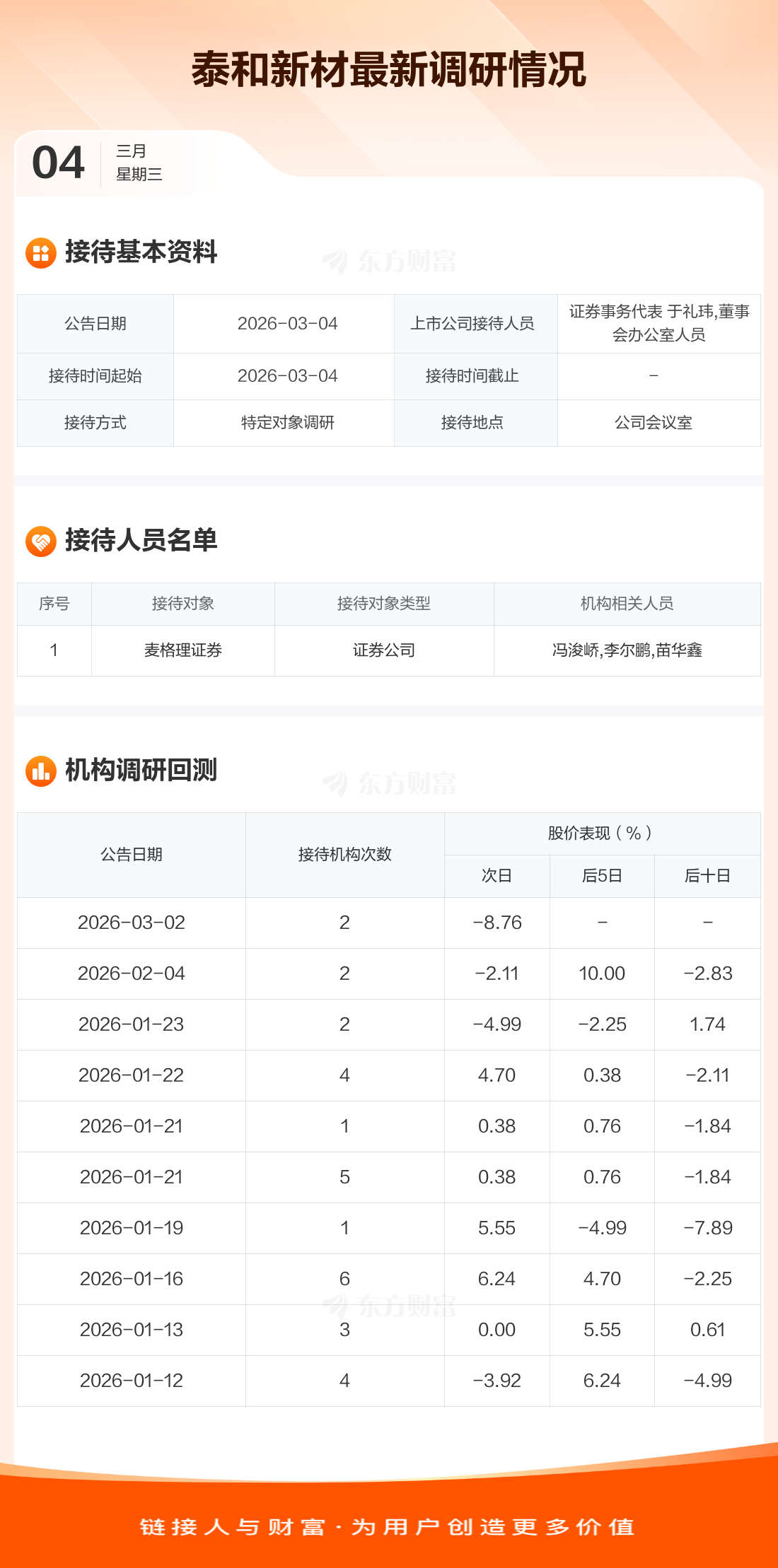 泰和新材3月4日公告称,3月4日接待麦格理证券等1家机构调研。接待人员包括证券事务代表 于礼玮,董事会办公室人员。