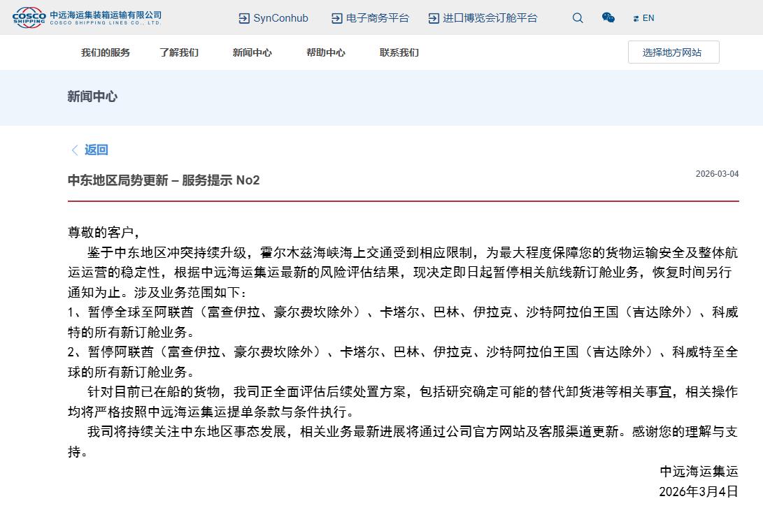 中远海运集运发布关于中东地区局势更新的服务提示(二)。鉴于中东地区冲突持续升级,霍尔木兹海峡海上交通受到相应限制,为最大程度保障您的货物运输安全及整体航运运营的稳定性,根据中远海运集运最新的风险评估结果,现决定即日起暂停相关航线新订舱业务,恢复时间另行通知为止。涉及业务范围如下:1、暂停全球至阿联酋(富查伊拉、豪尔费坎除外)、卡塔尔、巴林、伊拉克、沙特阿拉伯王国(吉达除外)、科威特的所有新订舱业务。2、暂停阿联酋(富查伊拉、豪尔费坎除外)、卡塔尔、巴林、伊拉克、沙特阿拉伯王国(吉达除外)、科威特至全球的所有新订舱业务。