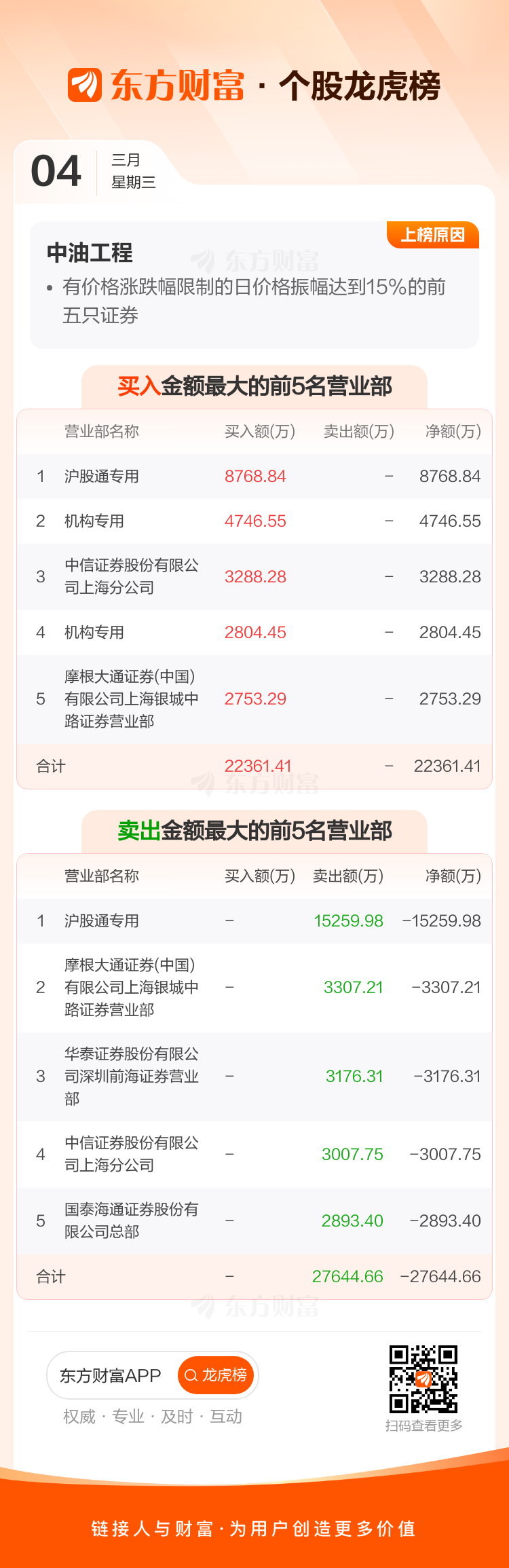 交易所2026年3月4日公布的交易公开信息显示,中油工程因成为有价格涨跌幅限制的日价格振幅达到15%的前五只证券上榜。中油工程当日收报5.24元,涨跌幅2.14%,偏离值19.91%,换手率9.29%,成交额26.37亿。