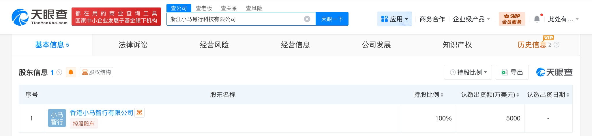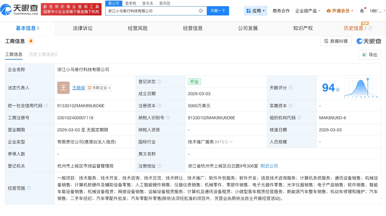 每经AI快讯,天眼查工商信息显示,近日,浙江小马易行科技有限公司成立,法定代表人为王皓俊,注册资本5000万美元,经营范围含软件外包服务、软件开发、信息技术咨询服务、计算机系统服务、通讯设备销售、人工智能硬件销售、电子产品销售、新能源汽车整车销售等。股东信息显示,该公司由香港小马智行有限公司全资持股。