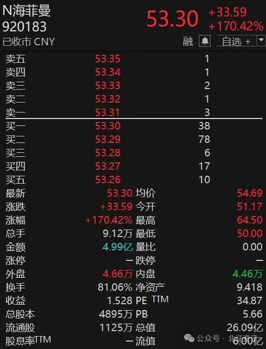 3月4日,昆山海菲曼科技集团股份有限公司(证券简称:海菲曼;证券代码:920183)在北京证券交易所上市。这只新股上市首日收盘报53.3元/股,涨幅超170%。