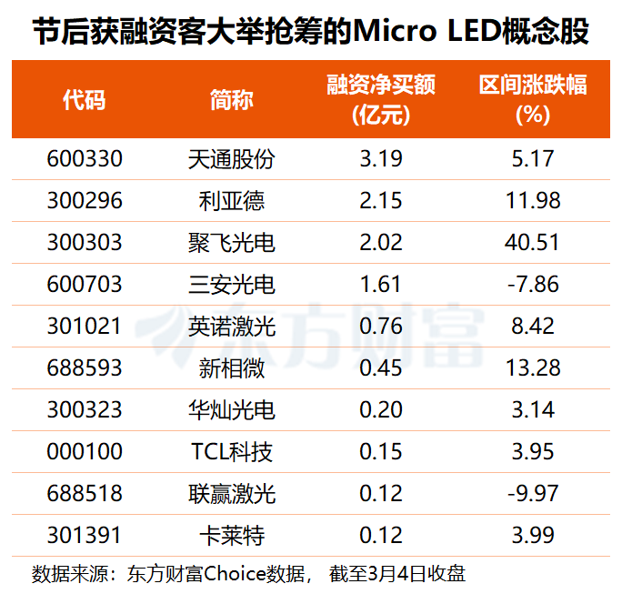 资金方面,东方财富Choice数据显示,节后以来,共有12只Micro LED概念股获得融资净买入,天通股份获杠杆资金加仓3.19亿元,利亚德、聚飞光电均获融资客抢筹超2亿元,三安光电也被抢筹1.61亿元。