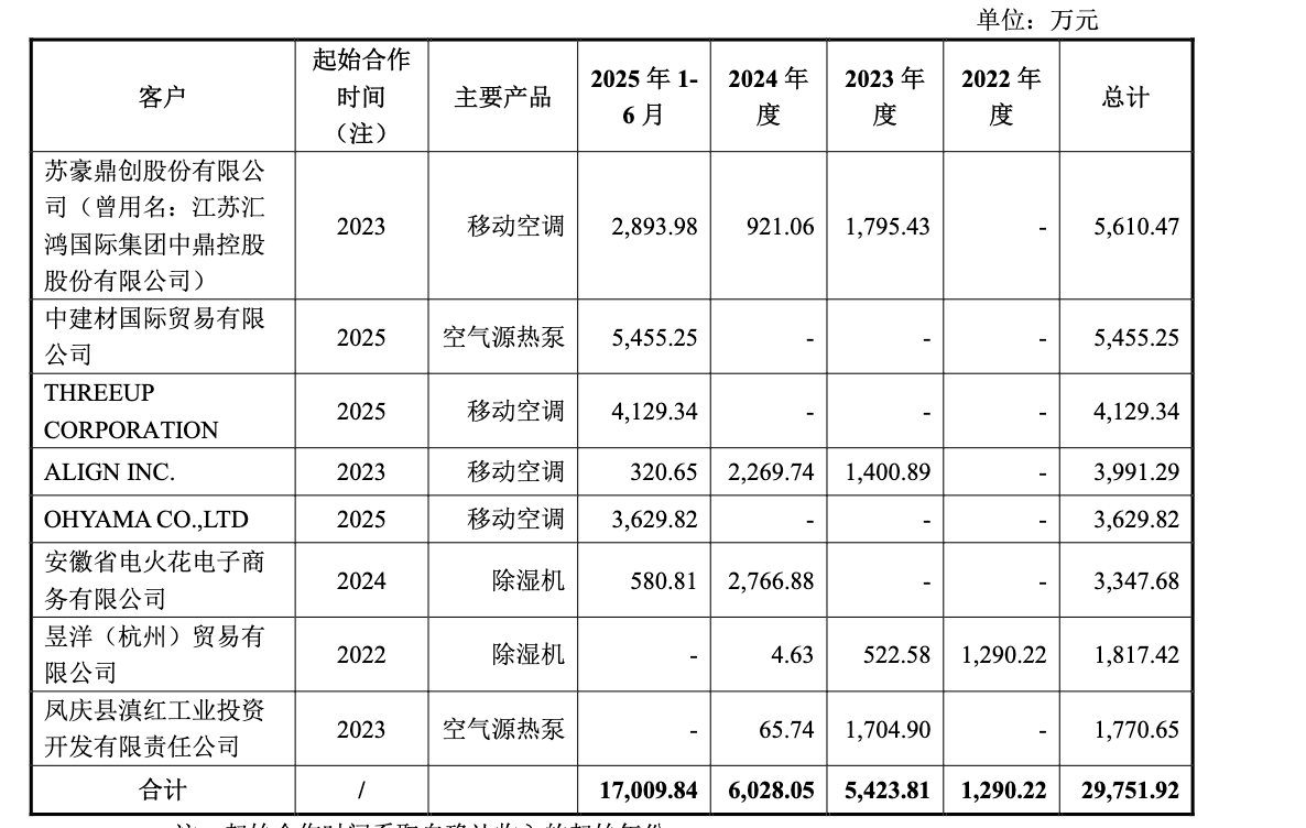根据回复函披露,2025年上半年,公司实现销售收入1000万元以上的新客户共8家,合计贡献收入1.7亿元。其中,当年新增合作客户包括:中建材国际贸易有限公司(下称“中建材贸易”)贡献5455万元、THREEUP CORPORATION贡献了4129万元,OHYAMA CO.,LTD 贡献了3630万元,三家贡献轻松超亿元。