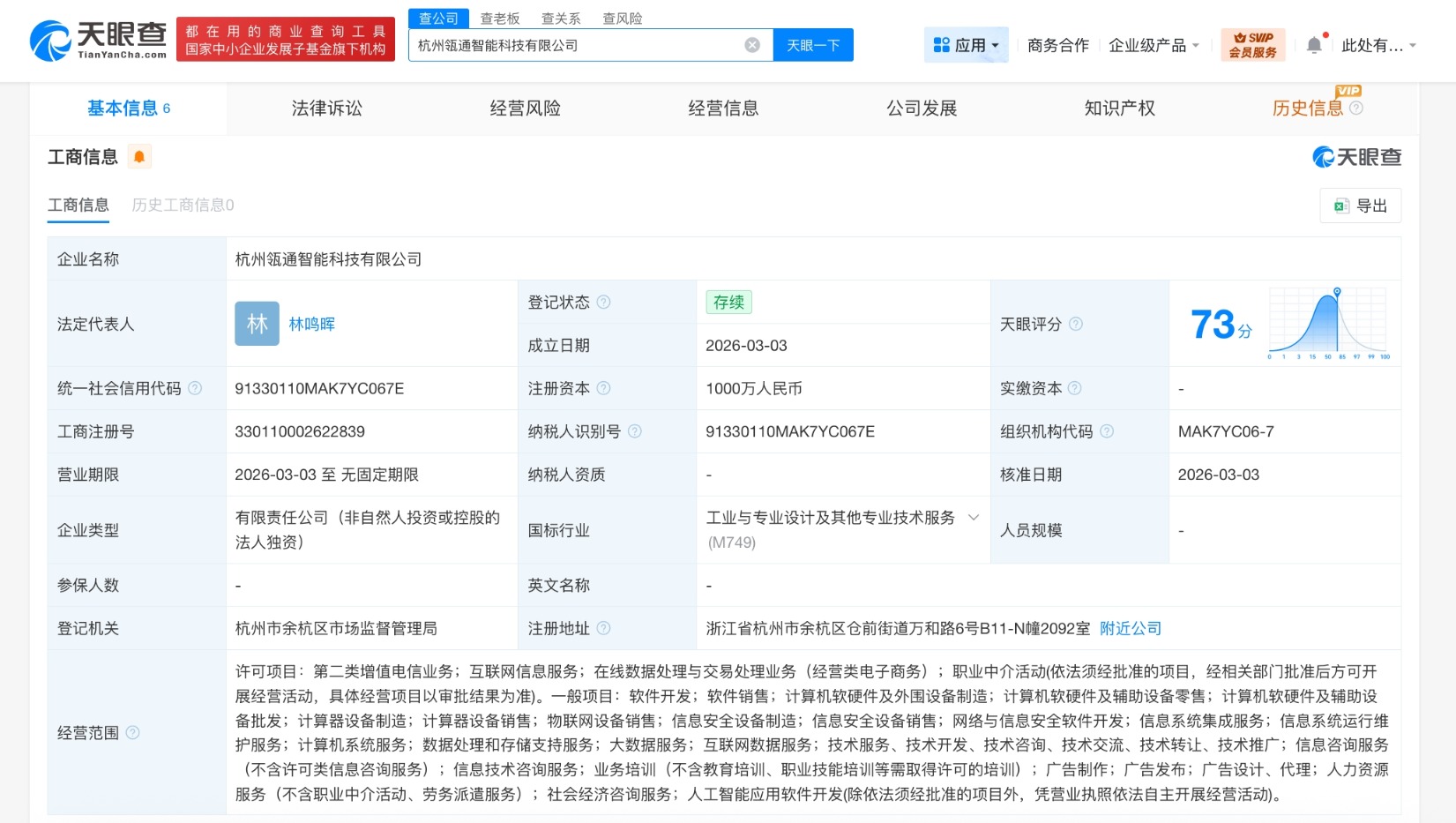 南方财经3月5日电,天眼查工商信息显示,近日,杭州瓴通智能科技有限公司成立,法定代表人为林鸣晖,注册资本1000万人民币,经营范围包括软件开发、计算机软硬件及外围设备制造、数据处理和存储支持服务、大数据服务、互联网数据服务、人工智能应用软件开发等。股东信息显示,该公司由阿里巴巴旗下北京锐讯灵通科技有限公司全资持股。