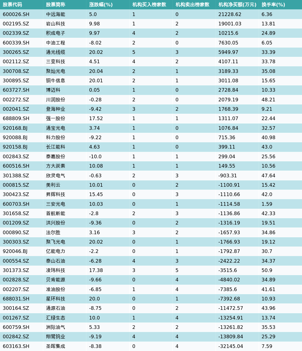 南财智讯3月5日电,盘后数据显示,因当日异动登上龙虎榜的个股中,36只沪深A股龙虎榜出现了机构的身影,机构合计净卖出36540.36万元,具体来看,机构净买入17只个股,净卖出19只个股。其中,机构净买入前三分别为中远海能(600026.SH)、岩山科技(002195.SZ)与积成电子(002339.SZ),详情见下图:机构净卖出的个股中,前三分别为圣晖集成(603163.SH)、翔鹭钨业(002842.SZ)与洲际油气(600759.SH)。